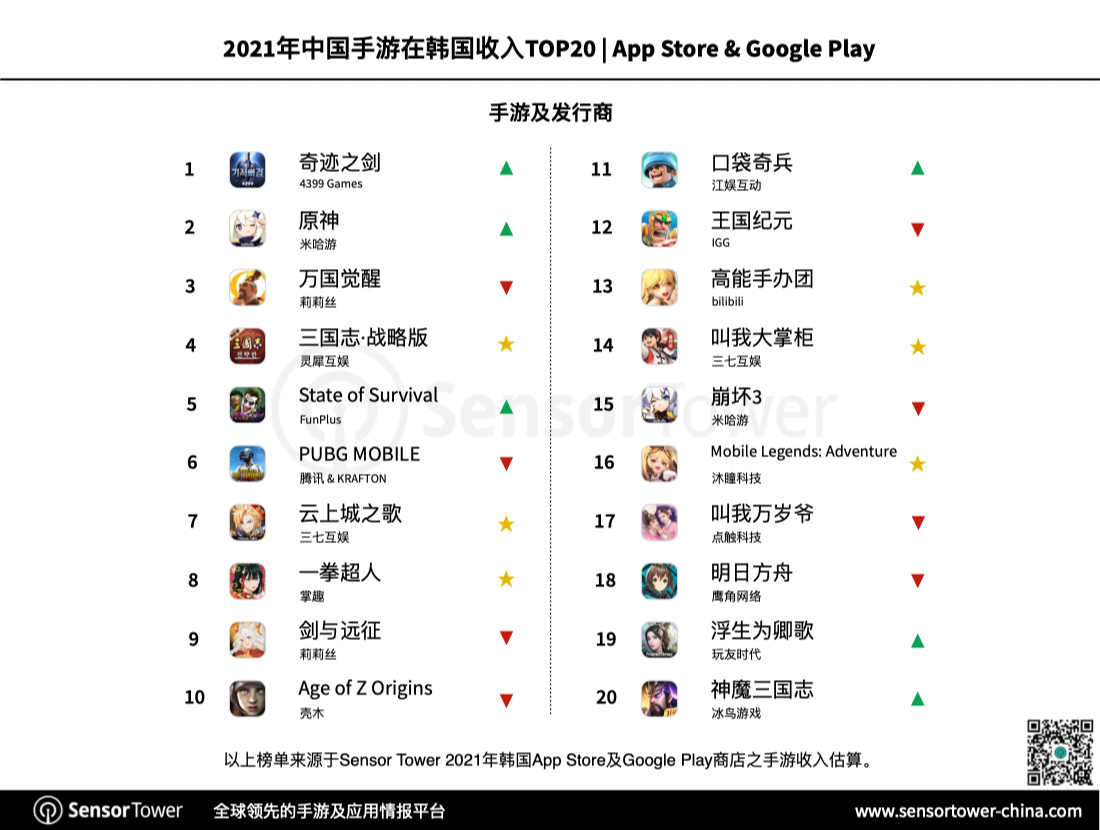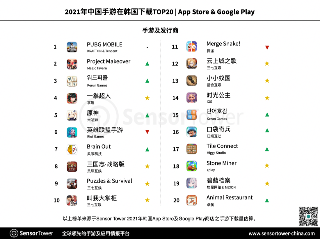 出海新游体现相同可圈可点,包含《三国志·战略版》、《云上城之歌》在内共6款新游在韩国收入超越1000万美元,并上榜出海收入榜Top 20。