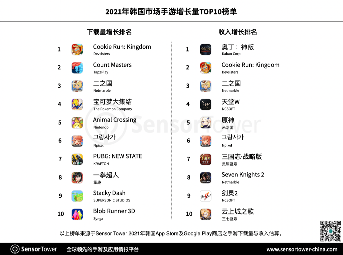 2021年可谓是新手游体现非常杰出的一年,共4款产品在韩国商场收入增加超越1亿美元,别离是《奥丁:神叛》、《 Cookie Run: Kingdom》、《二之国》和《天堂W》。