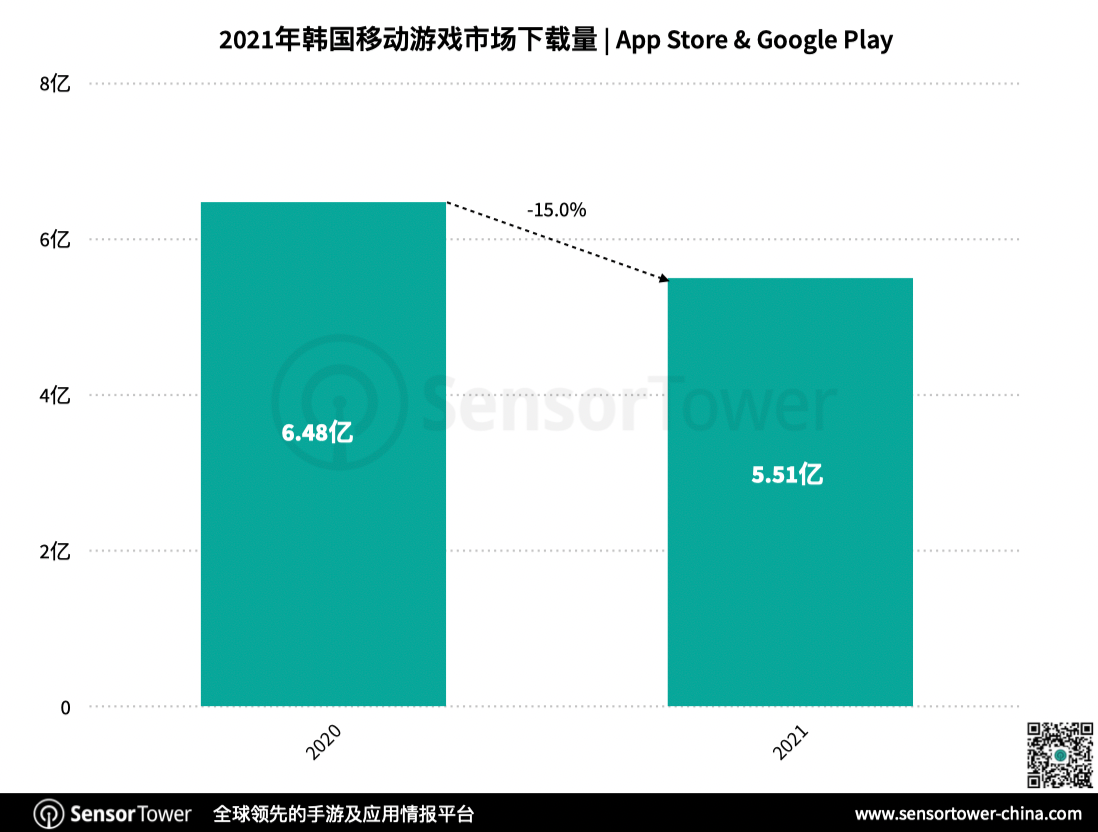 依据Sensor Tower 发布的商铺情报数据,虽然2021年韩国移动游戏商场下载量同比略有下降,但收入仍旧增加6.5%,到达57.2亿美元。
