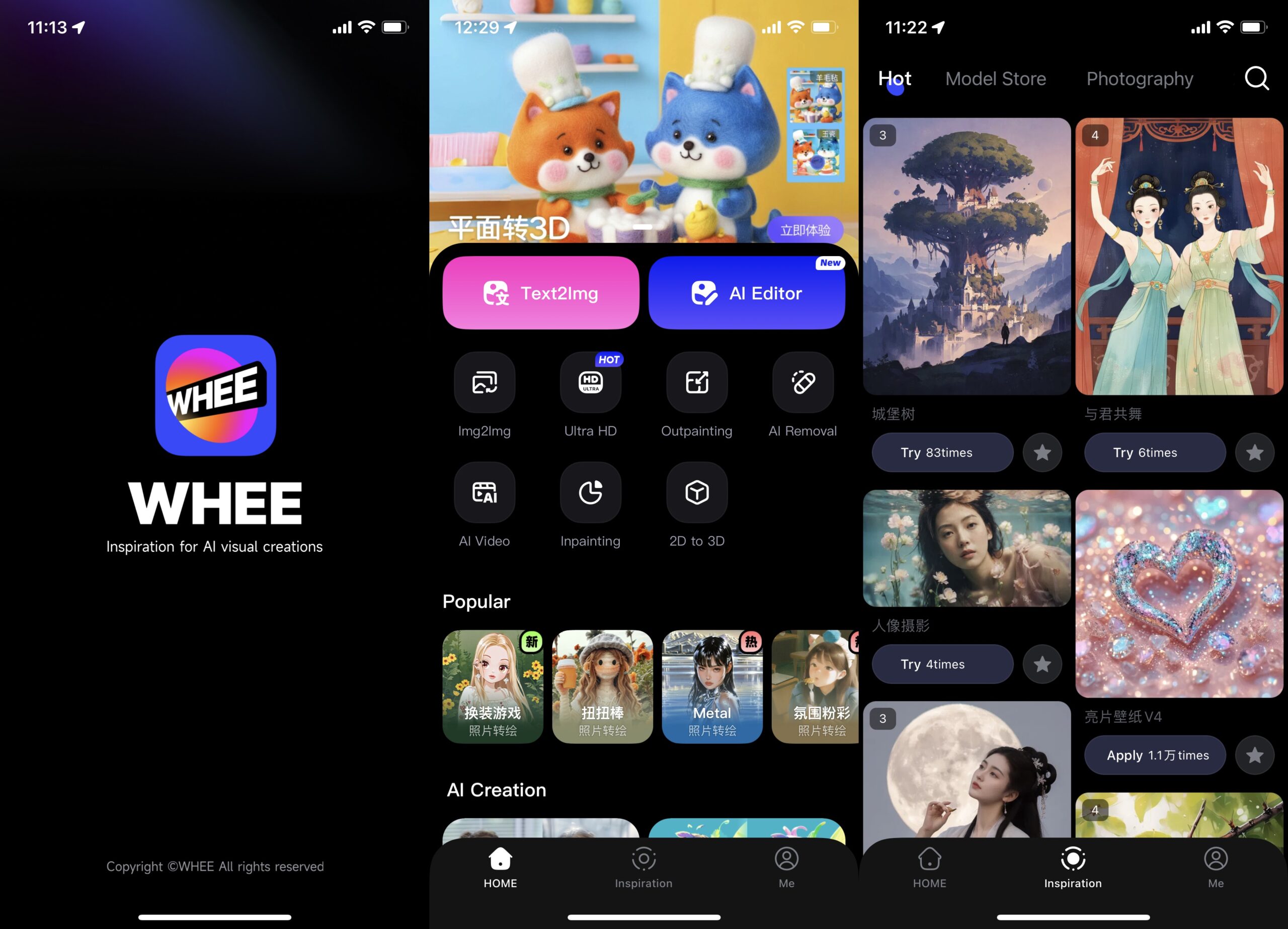 WHEE App 主界面简略直白,显眼方位为其各项 AI 功用,包含文生图、AI 创造、平面转 3D、AI 扩图等。运用还供给了丰厚的教程和示例,协助用户了解和运用各项功用。