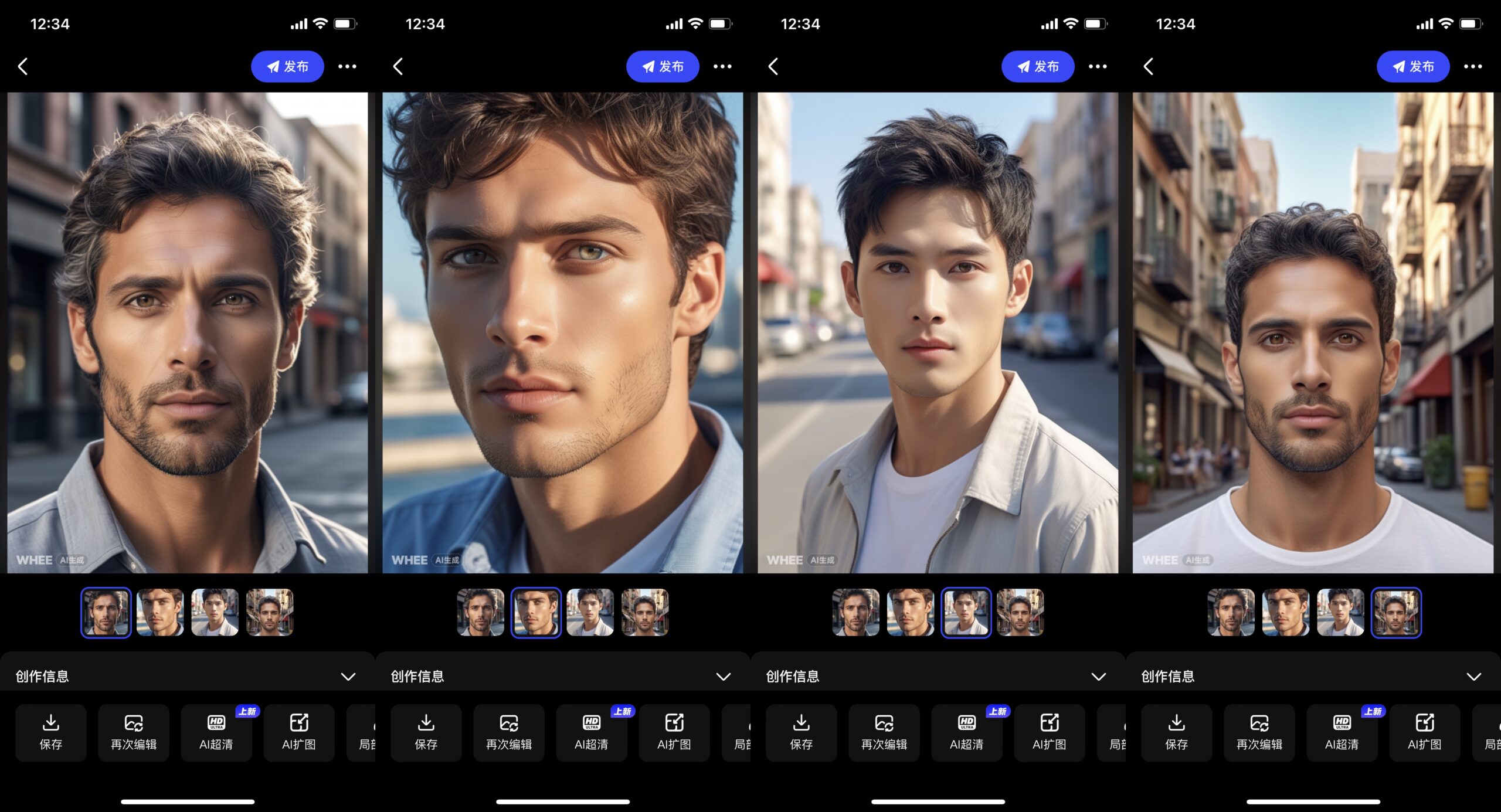 使用 App 的描绘词智能联想功用,得到描绘“高清实拍,1 个男人,明晰的五官,城市风景,4K 分辨率,实在主义,细致入微,天然阳光,润滑皮肤“,成果如下: