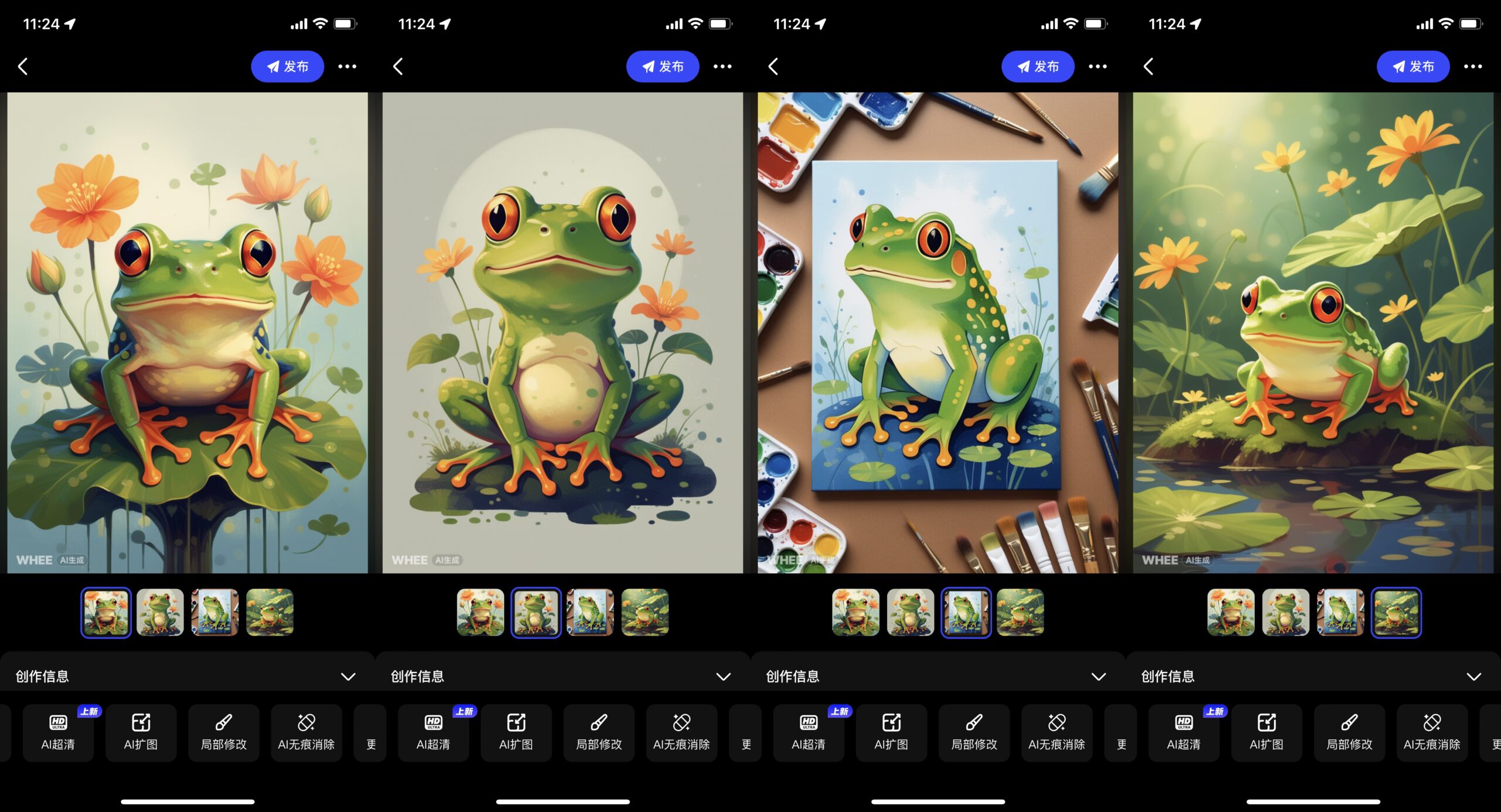 咱们以“创意”中的“心爱龙”为模版,加入了描绘“画风心爱的青蛙”,生成成果如下: