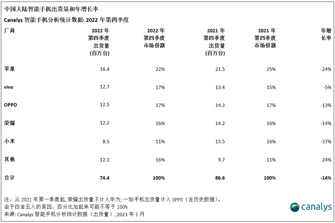 依据Canalys发布的研讨报告,2022年我国智能手机出货量同比下降14%至2.87亿部,是近十年来首度跌入3亿部以下,vivo摘得全年出货桂冠,仅荣耀和苹果别离完成全年增加30%和4%,别离位列商场第二和第三。高端顾客在经济动乱中展现出必定耐性,加上苹果的降价促销战略,其全年占有率以18%的成果创下史高。2022年第四季度,我国大陆手机商场仍旧在低位运转,全体出货7440万台,同比跌落14%。其间,苹果受发布节奏及郑州富士康出产连续性影响,同比跌落24%,但其仍依托iPhone14 系列的发布出货1640万台,位居第一。vivo遭到苹果旺季的竞赛, 以17%的商场份额位居第二,出货1270万台。OPPO(包括一加)出货1250万台,排名第三,坚持了其在第三季度的成果。荣耀出货1220万台,出货量排名下滑至第四。小米以850万台出货,坚持排名第五。