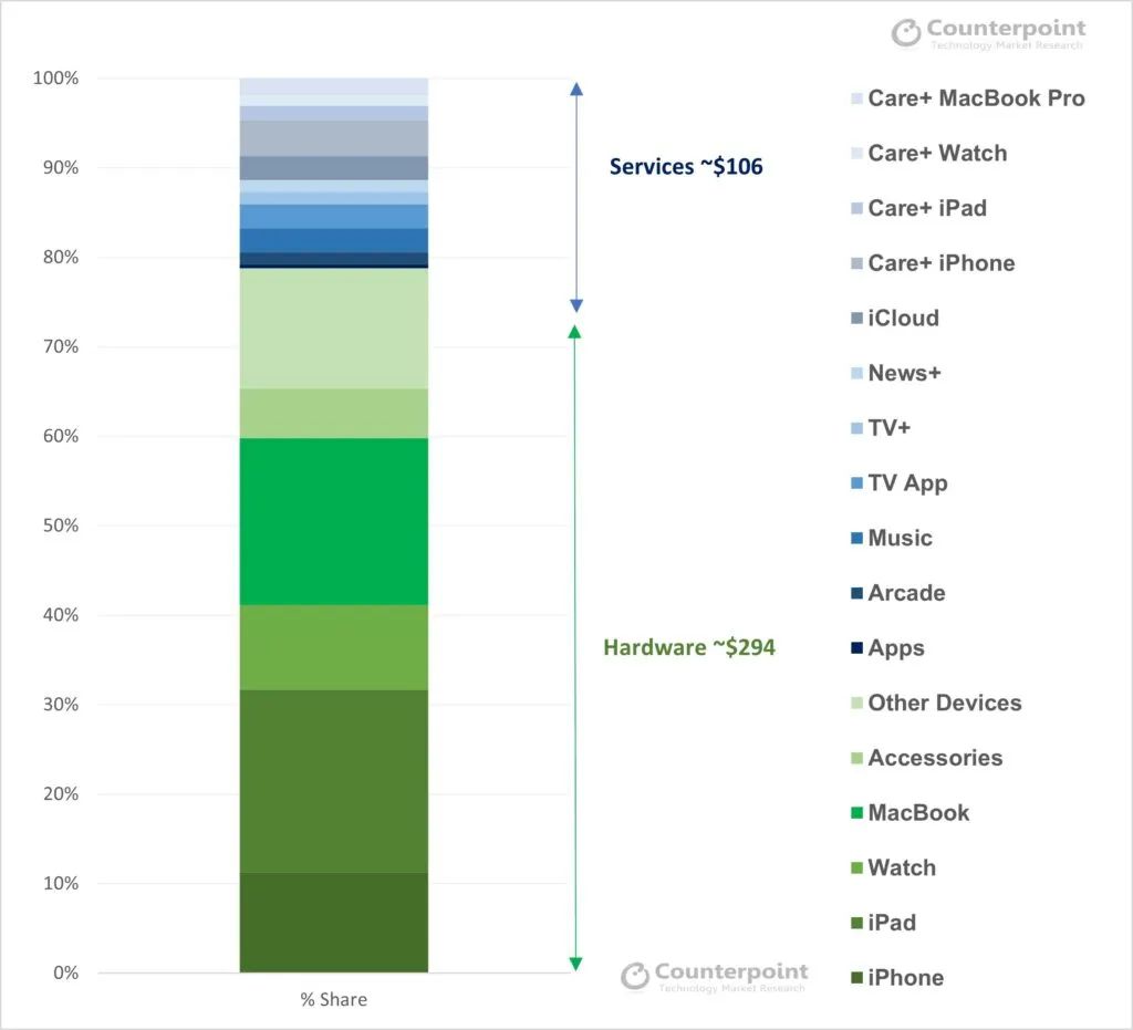 每月苹果高档用户的ARPU(硬件 + 服务),算计400美元